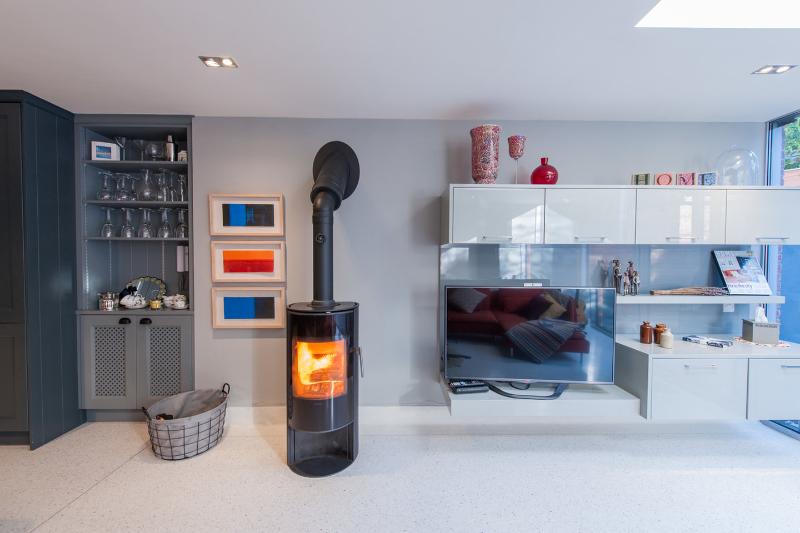 The combination of the TV panel and chimney creates an inviting environment where relaxation is at the forefront. The warmth of the fire, paired with the soothing glow of the TV screen, makes the room a perfect space for unwinding after a long day. The thoughtful layout ensures that the space feels cozy and functional, perfect for family nights or hosting guests.